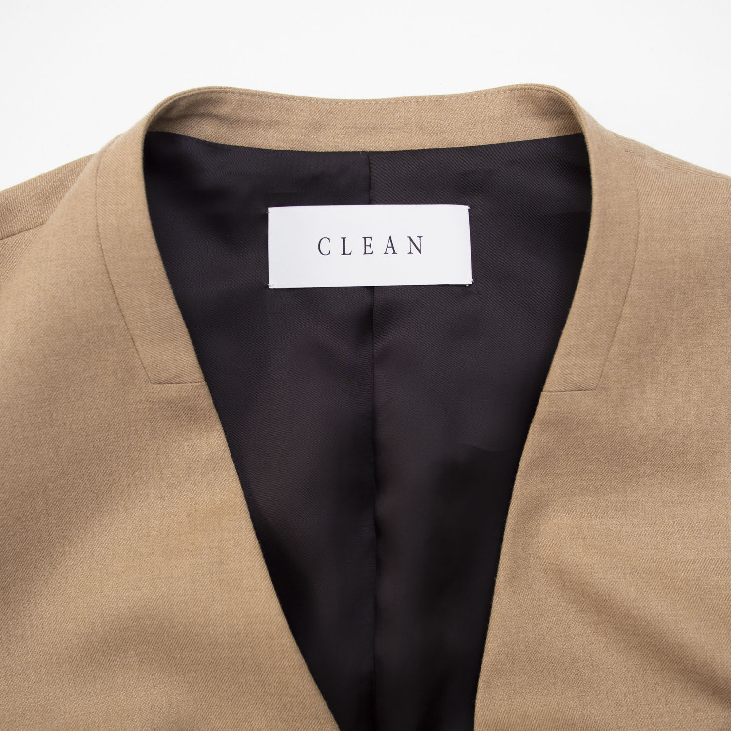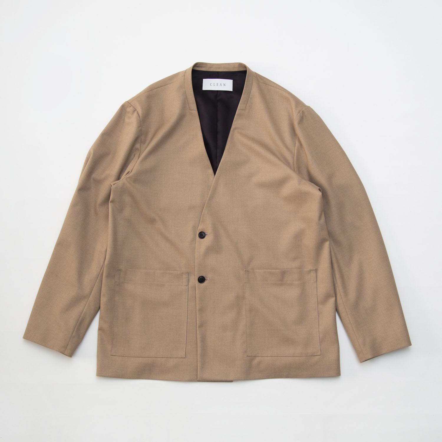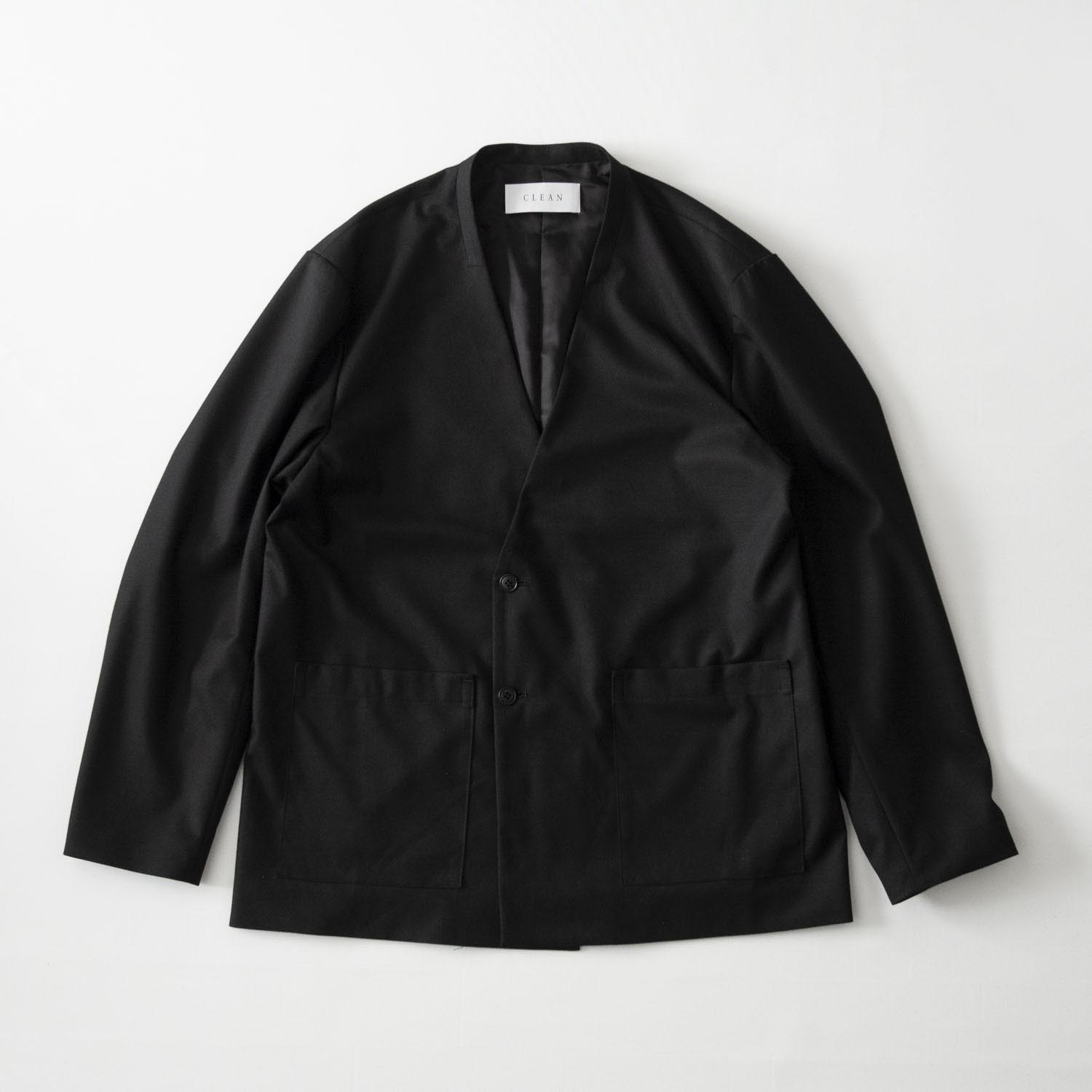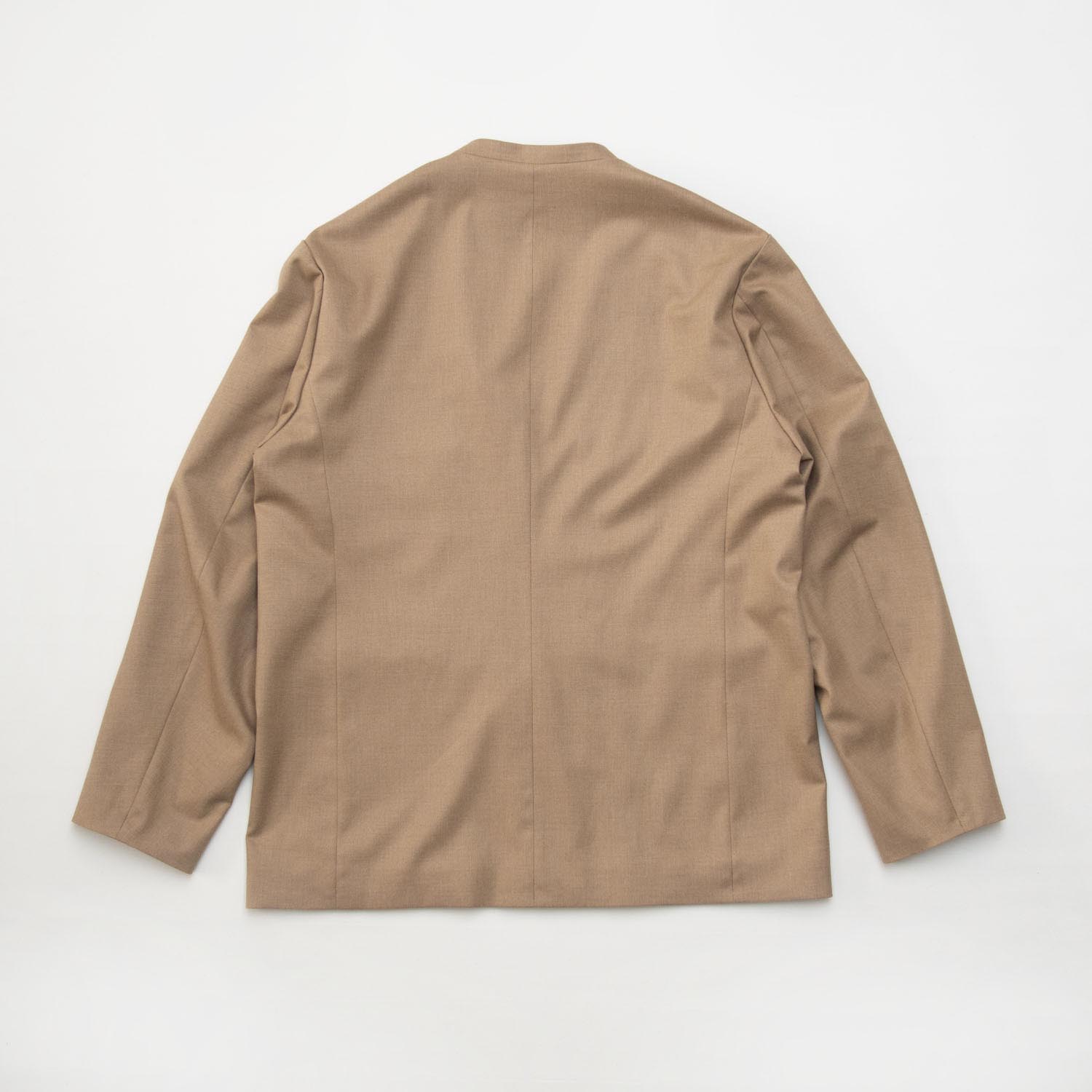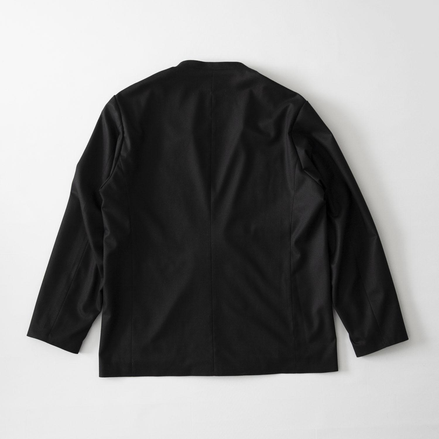 イージーケア素材を使用した、ゆったりとしたダブルブレスト風ノーラペルのブレザー